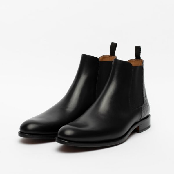 Our Hiro Boot in Midnight features a bold update from the classic Chelsea style giving you that perfect new jump into our boot collection. With their easy pull-on and pull-off feature. they are going to be a nice fit for all those special occasions. The upper material has been constructed from a boxcalf leather from Italy. and the cuff is constructed from a full grain leather with an embossed croc detailing. The interior is fully-lined with natural calfskin. and the sole unit is stacked leather with a rubber insert. They easily become an instant favorite having them made with Blake Construction.